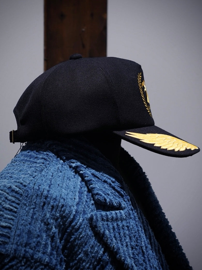 The unconventional cap "Nishiki Sogu" is an essential part of the navy blazer look.