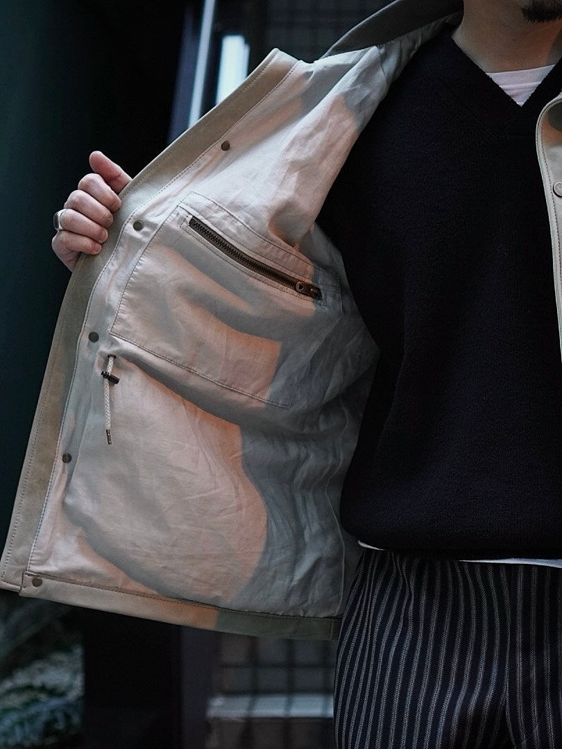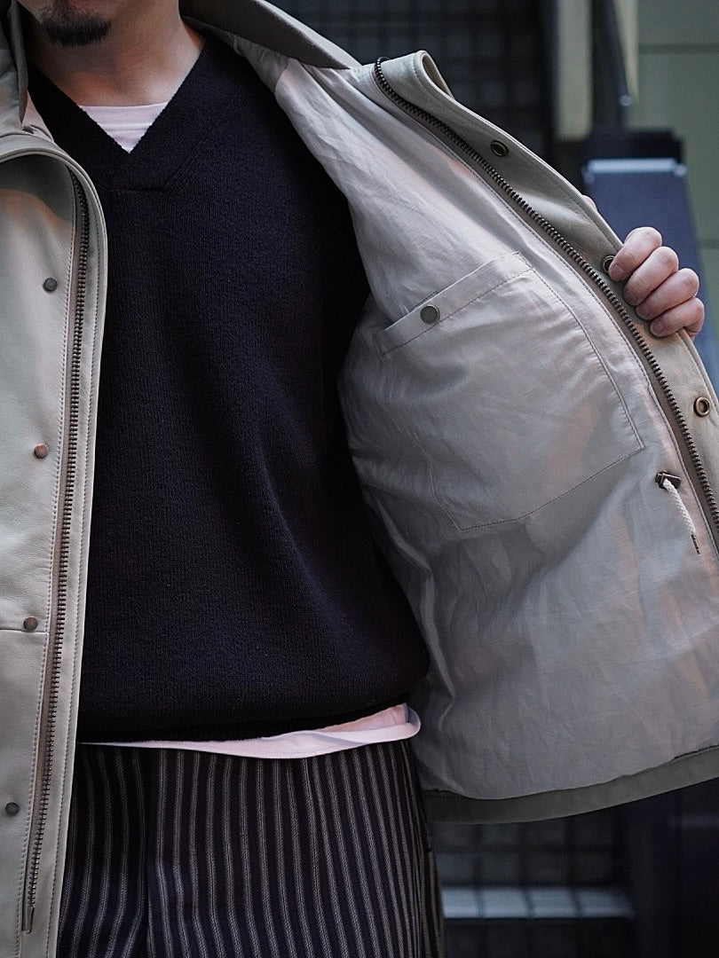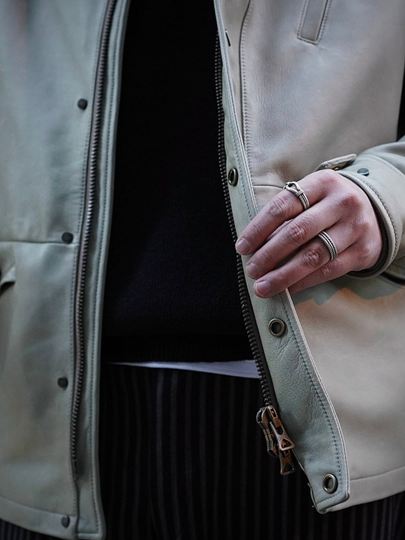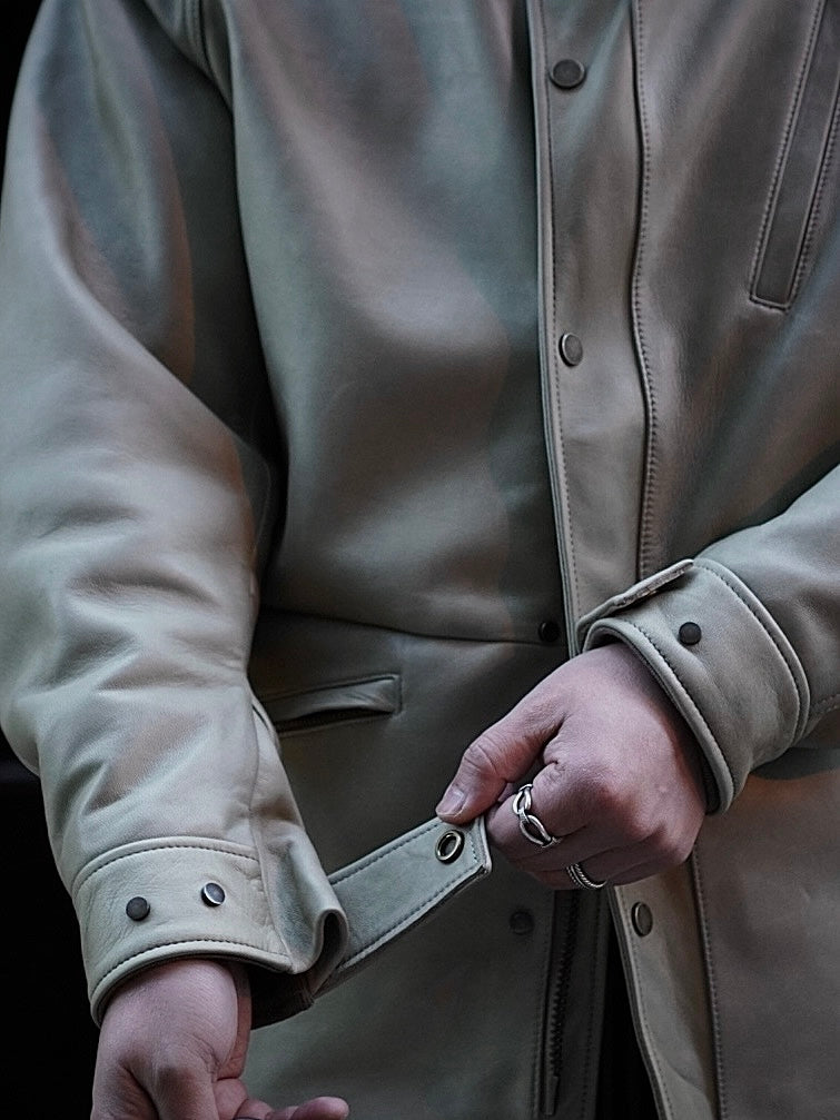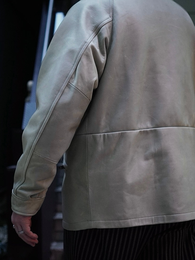 フードが外付けで独特で個性的な襟構造をもった1着でそのオリジナル古着からレザーに対応した仕様に修正しながらこの形に行きついた。