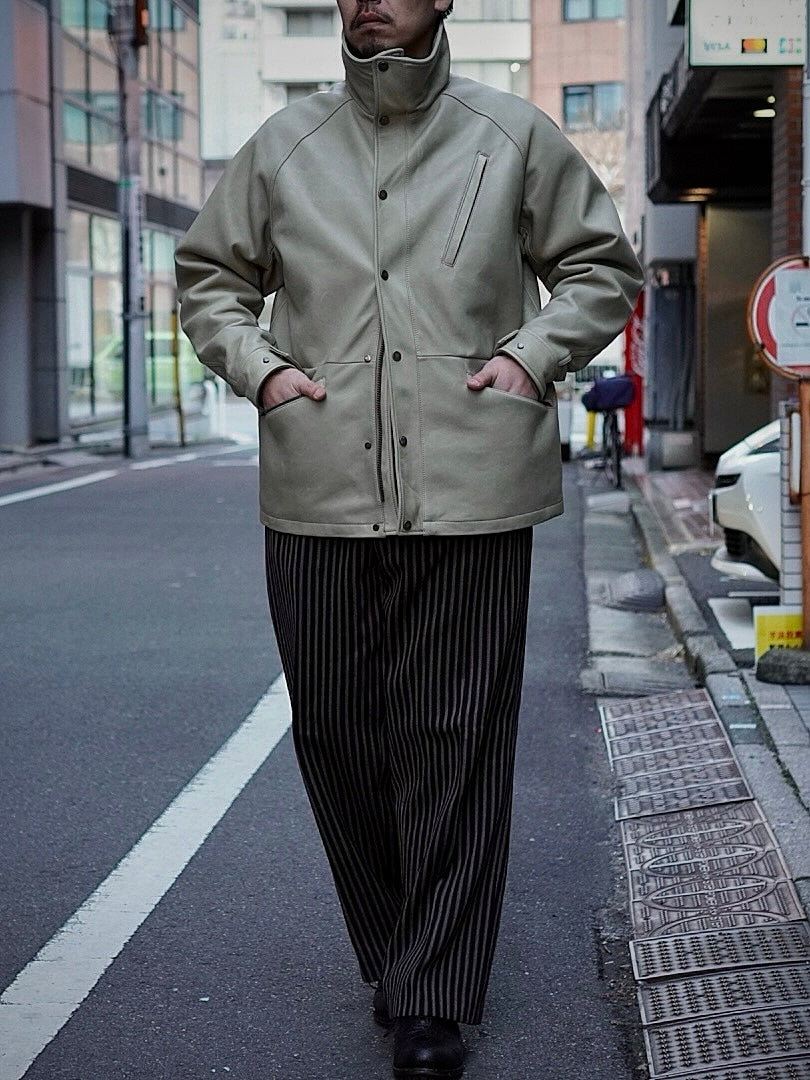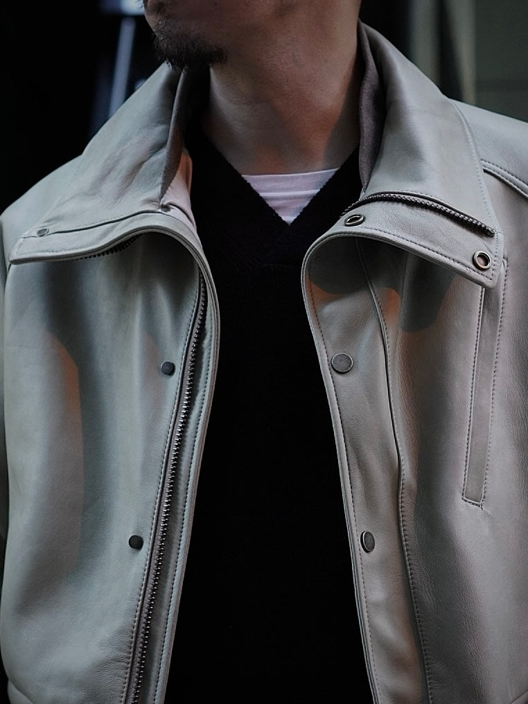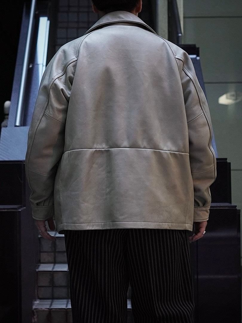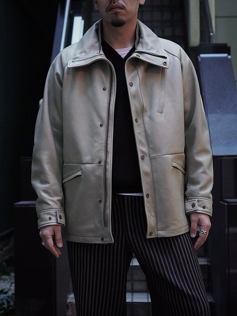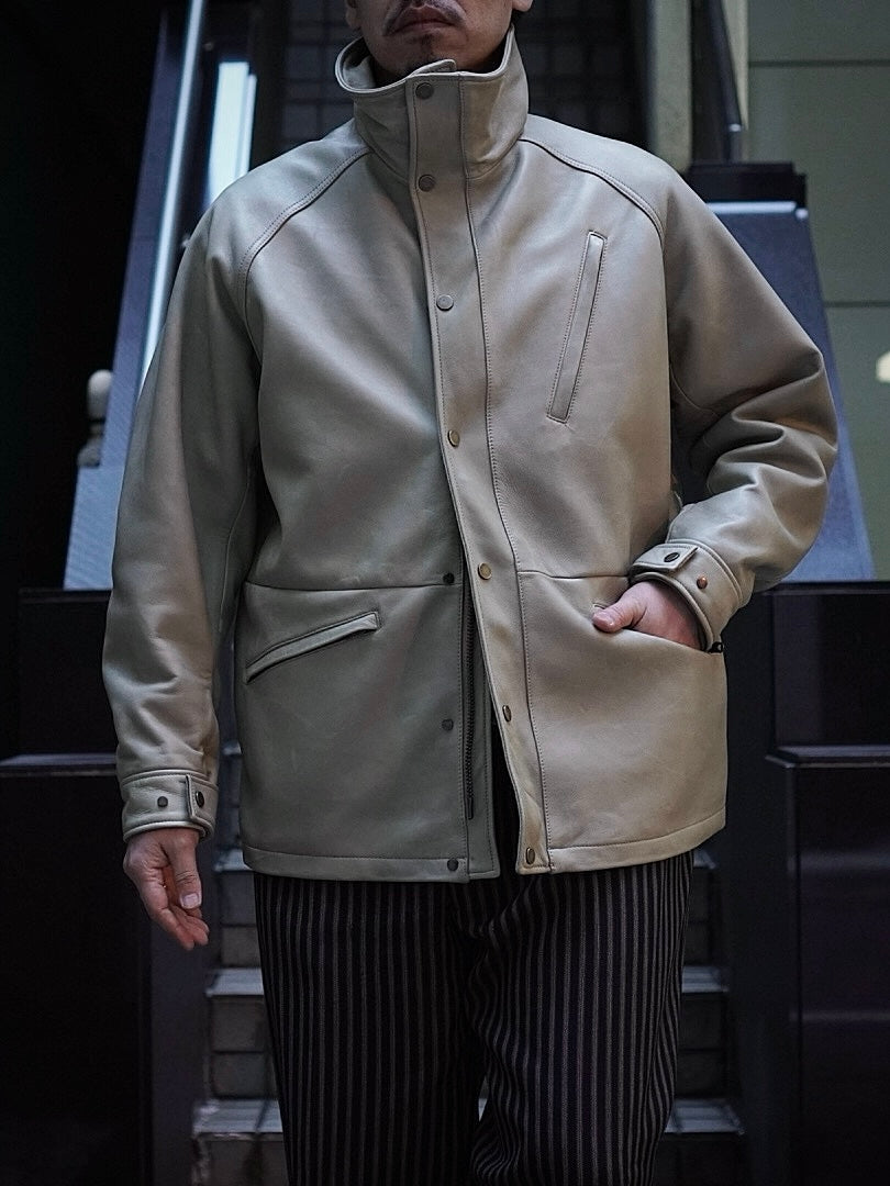 フードが外付けで独特で個性的な襟構造をもった1着でそのオリジナル古着からレザーに対応した仕様に修正しながらこの形に行きついた。