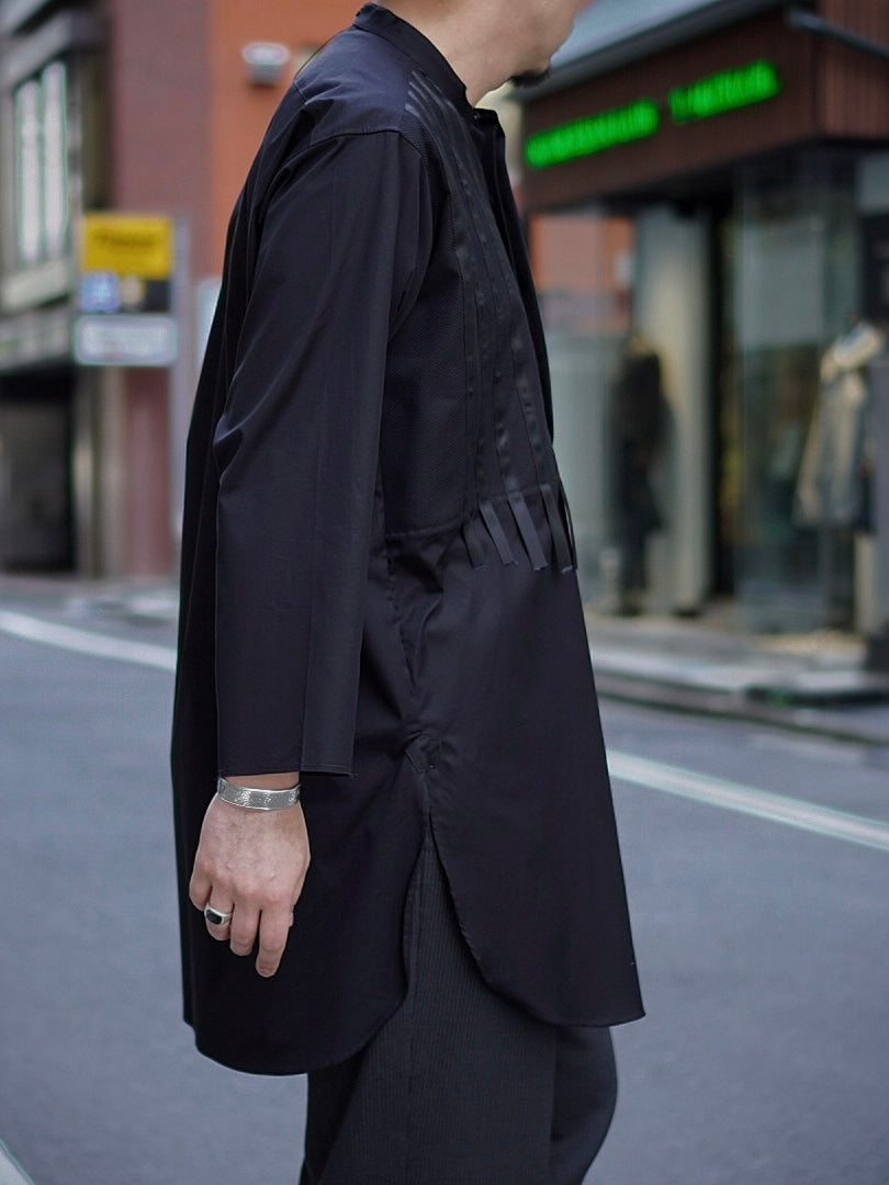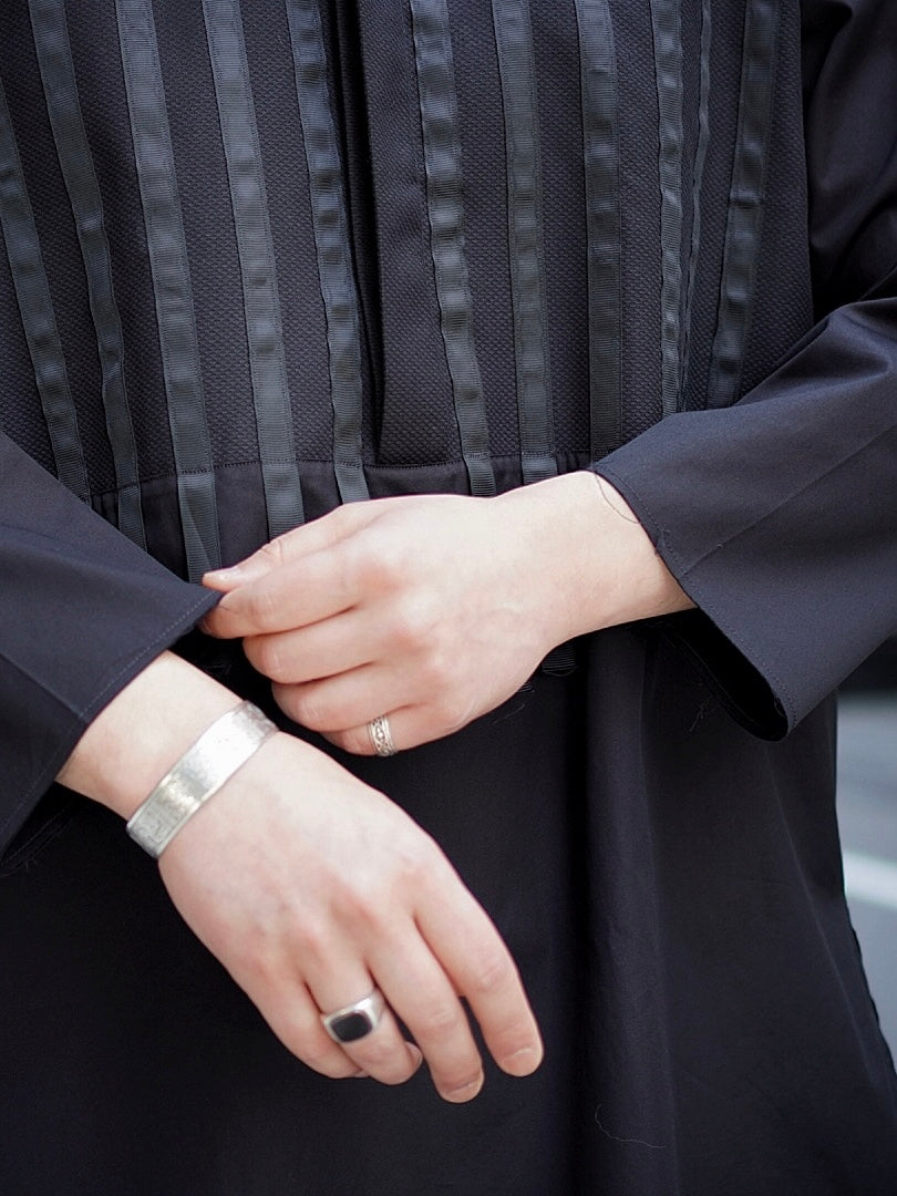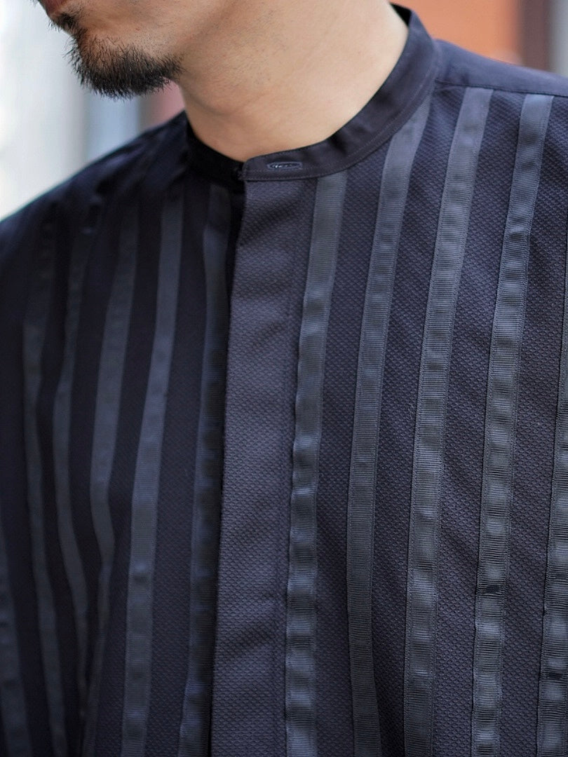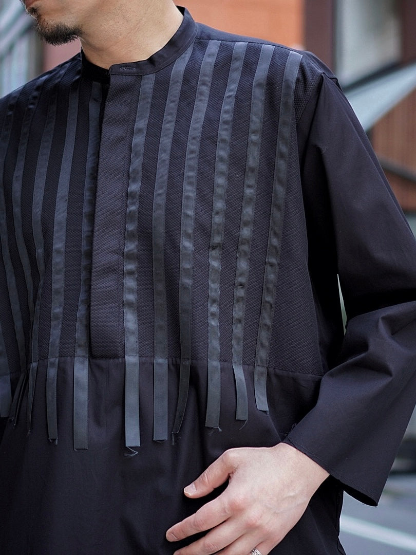 A pullover shirt featuring a shiny ribbon on the chest and raw cut sleeves.
