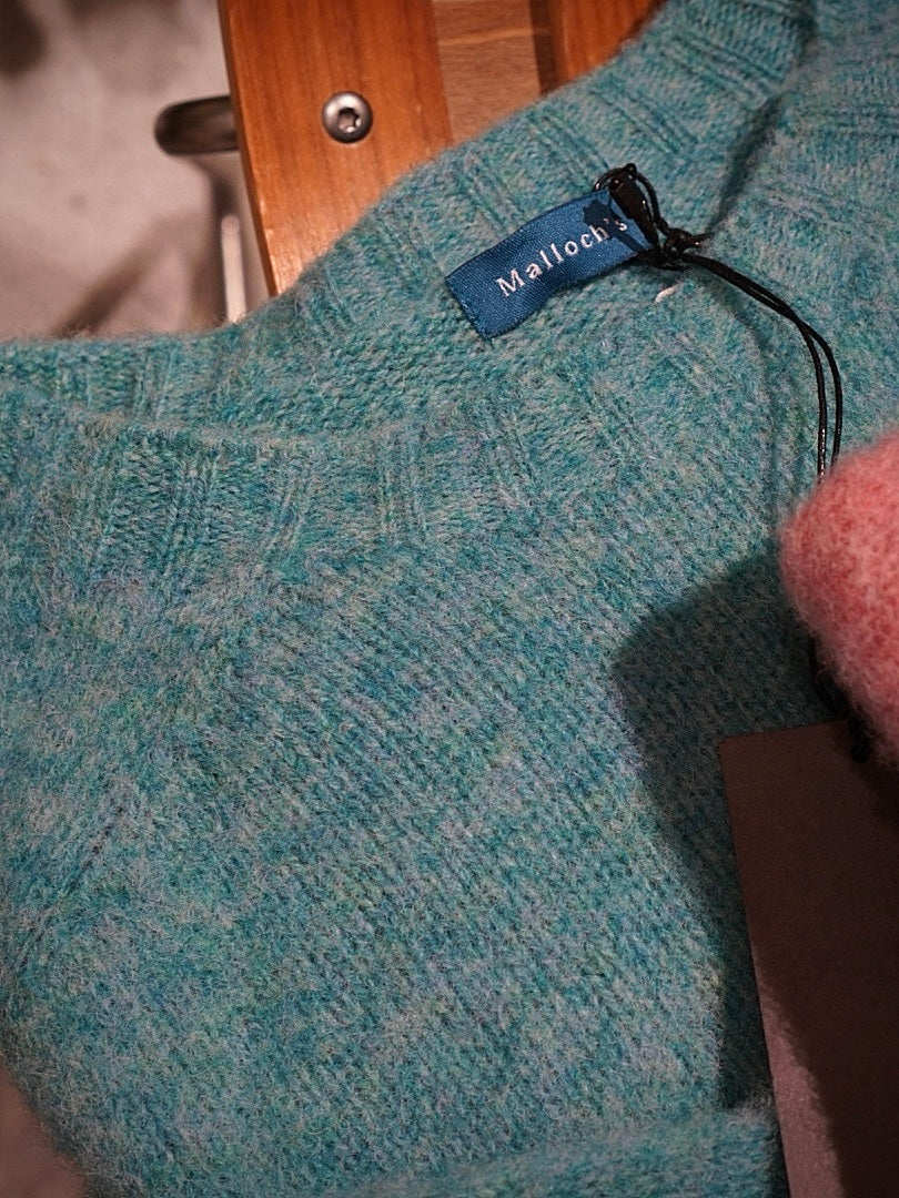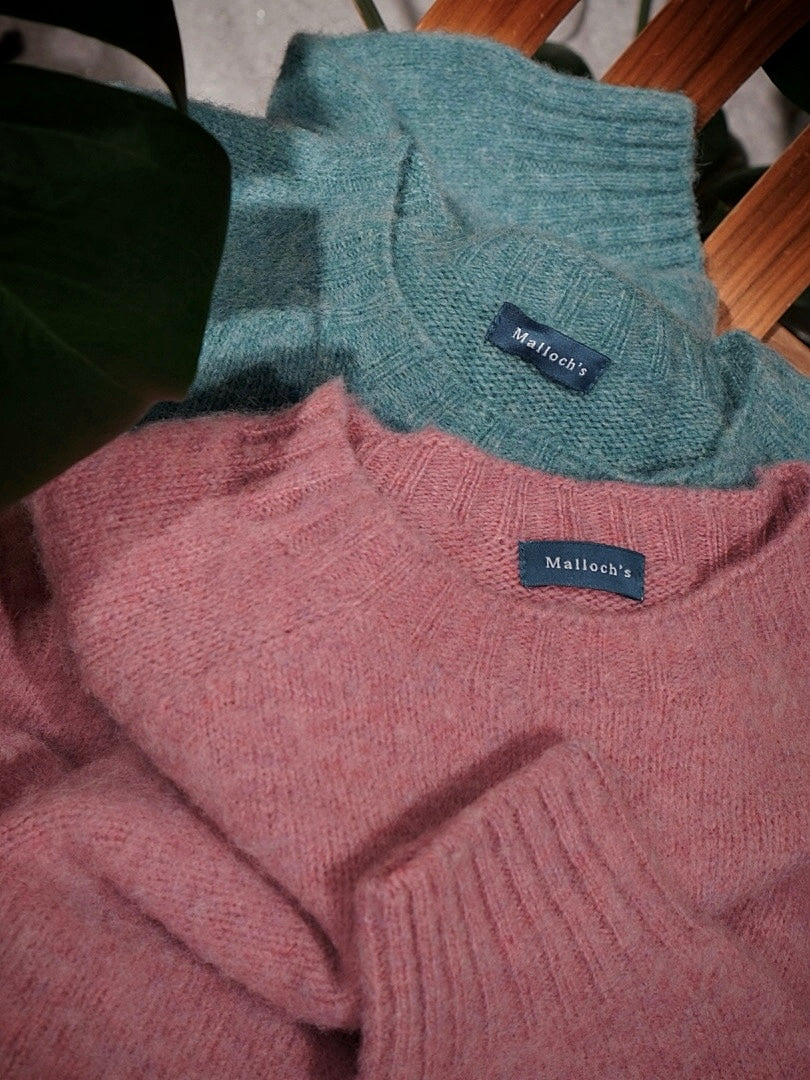 Malloch'sのシャギードッグセーターは、編んだ後にヴィンテージのブラッシングマシンで加工され、素材の奥行きと温もりが強調されています。