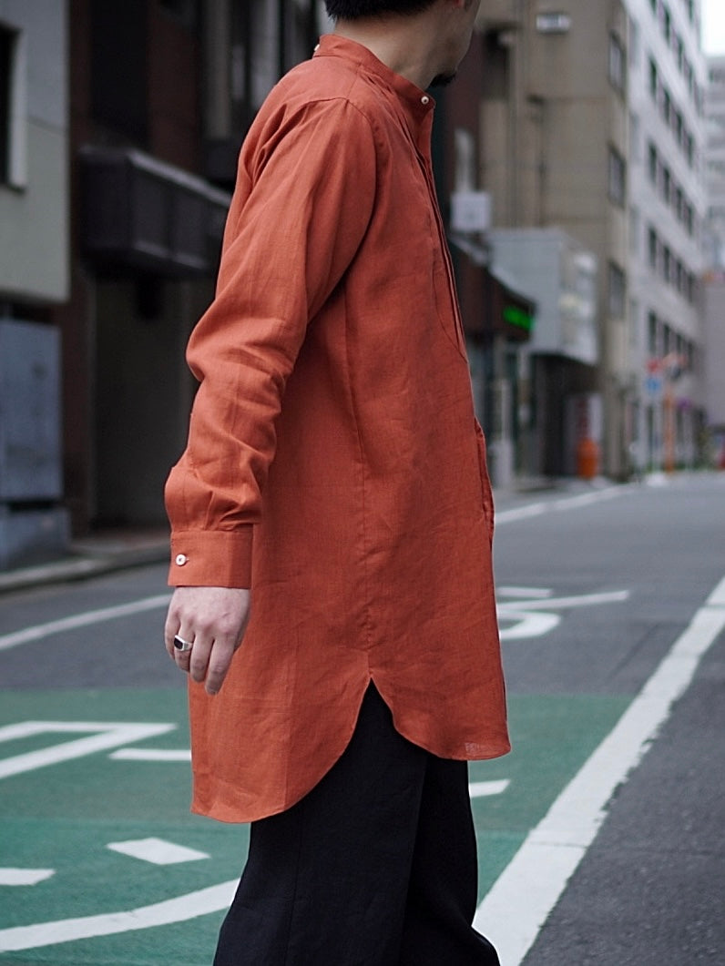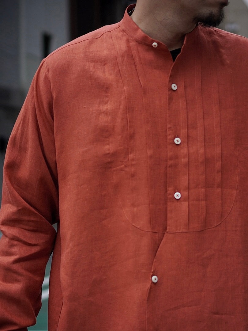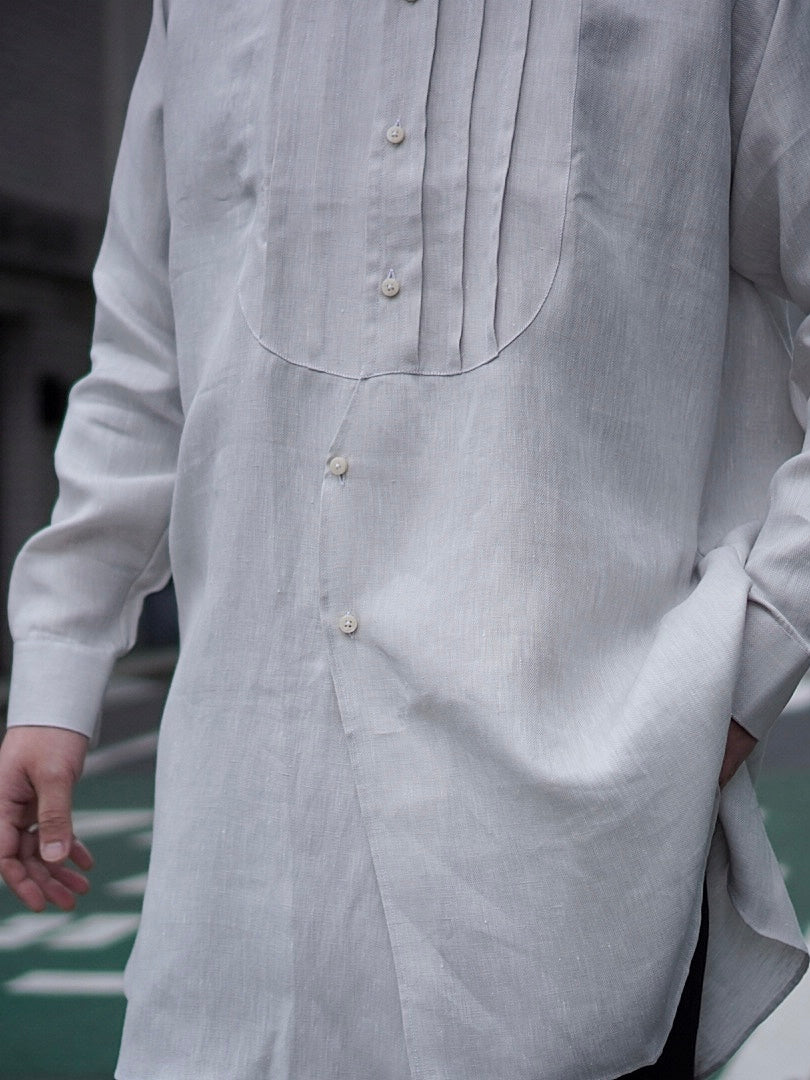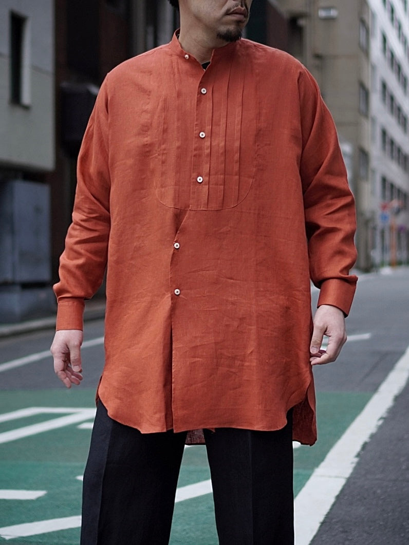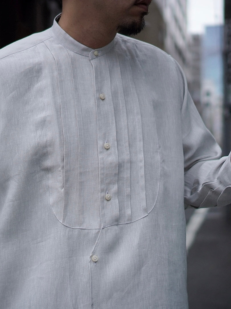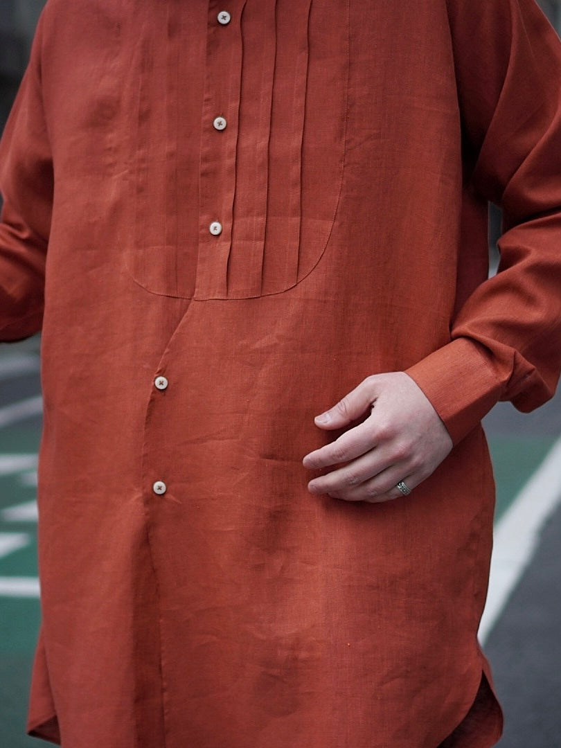 This shirt is based on the "grandpa shirt", which was originally French workwear that also served as underwear, and adds dress elements that are unique to a tailor.