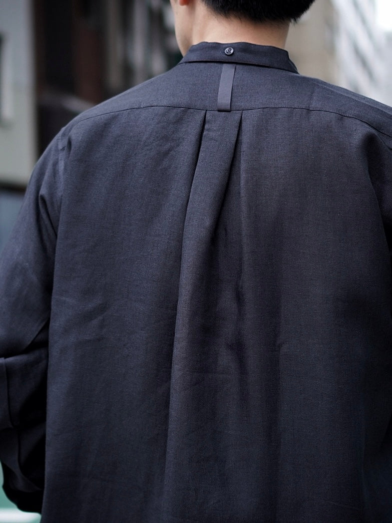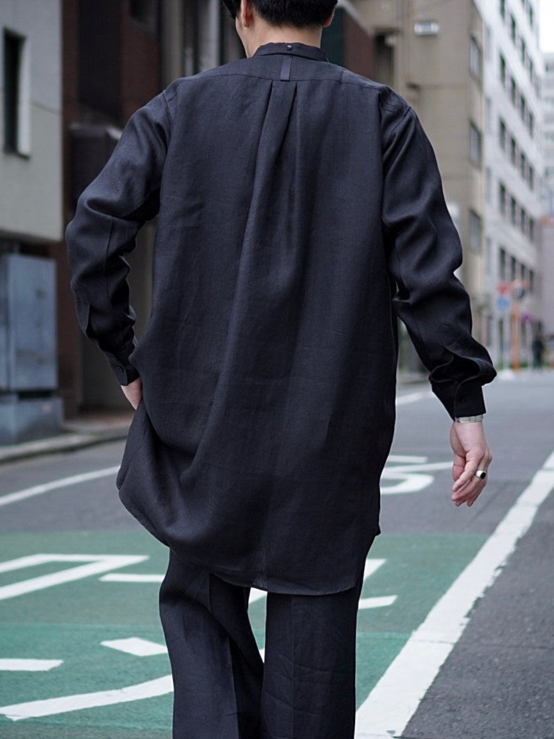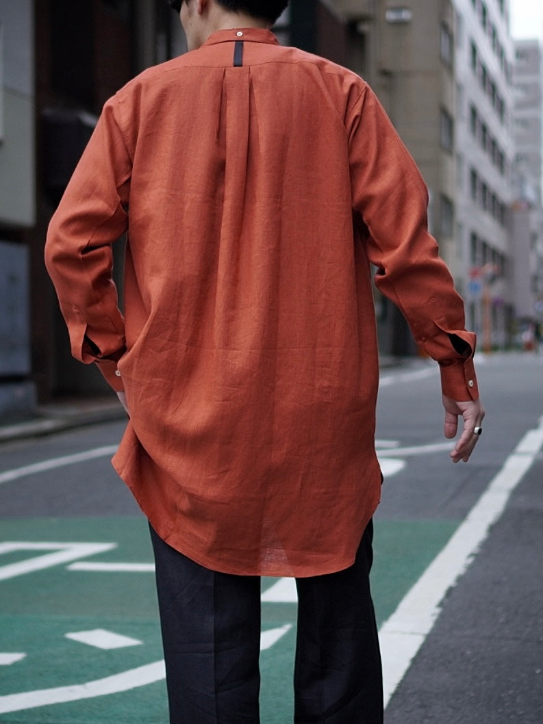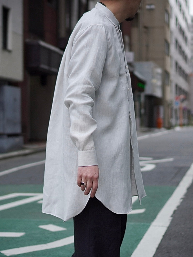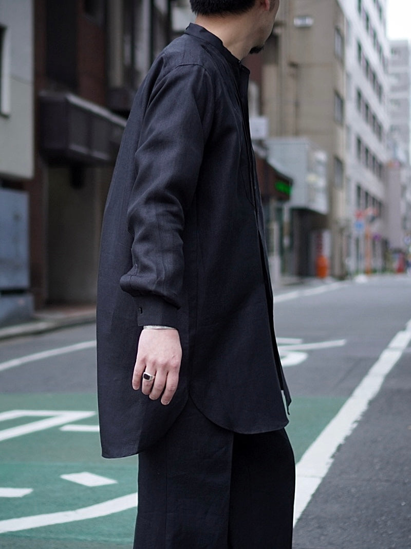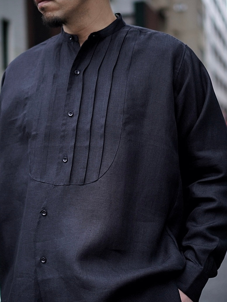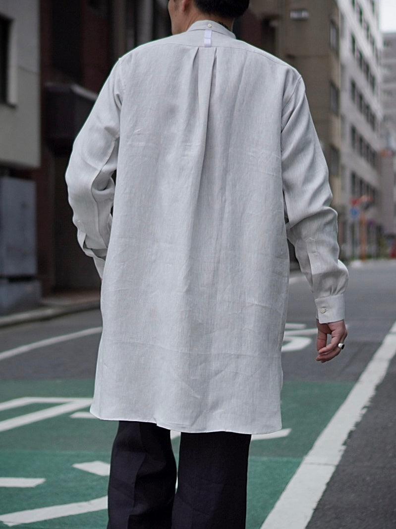 This shirt is based on the "grandpa shirt", which was originally French workwear that also served as underwear, and adds dress elements that are unique to a tailor.