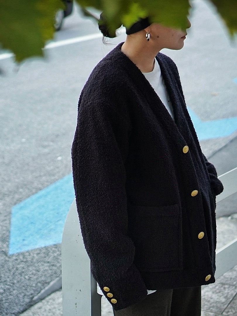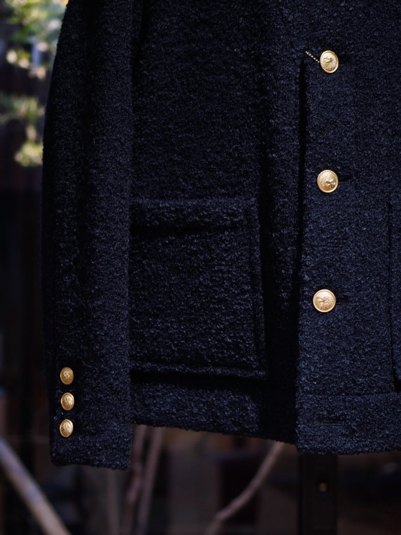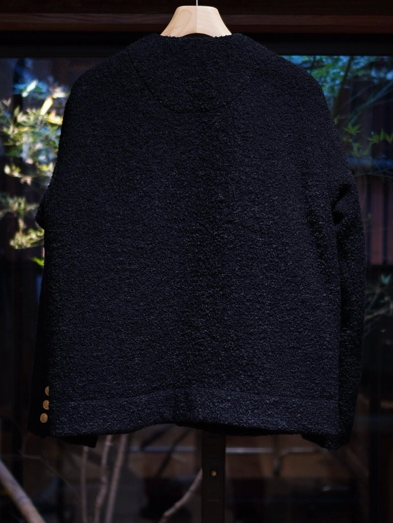 素材には、ウール/モヘアを用いたオリジナル生地を採用。整理加工を極力抑え、生機に近いランダムなループ感を残しつつ、縮絨によってニットのような柔らかさと立体感を持たせています。