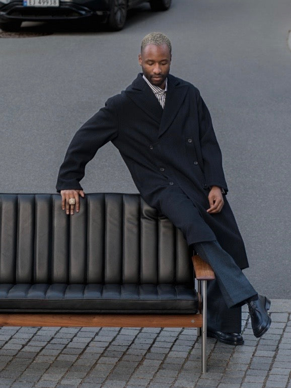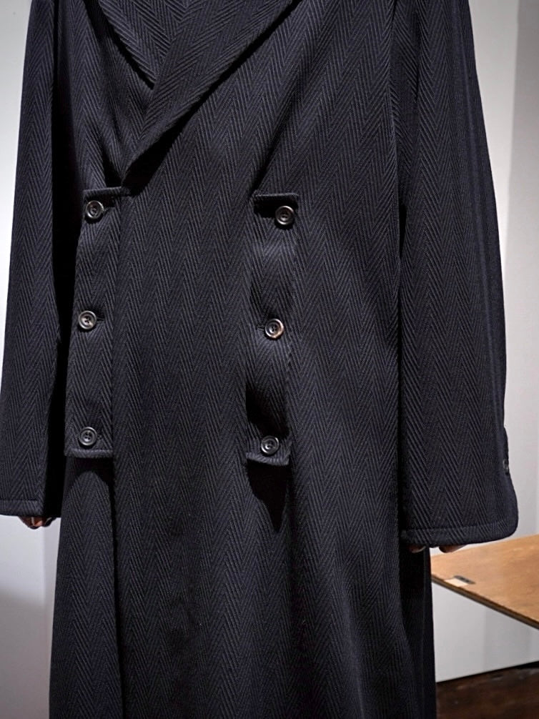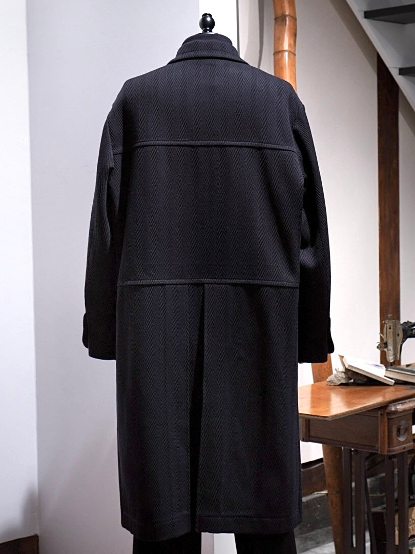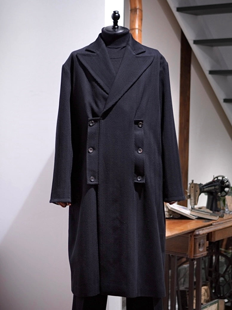 厚みのあるブラックヘリンボーンウールを用いたロングコート"DUKE"。