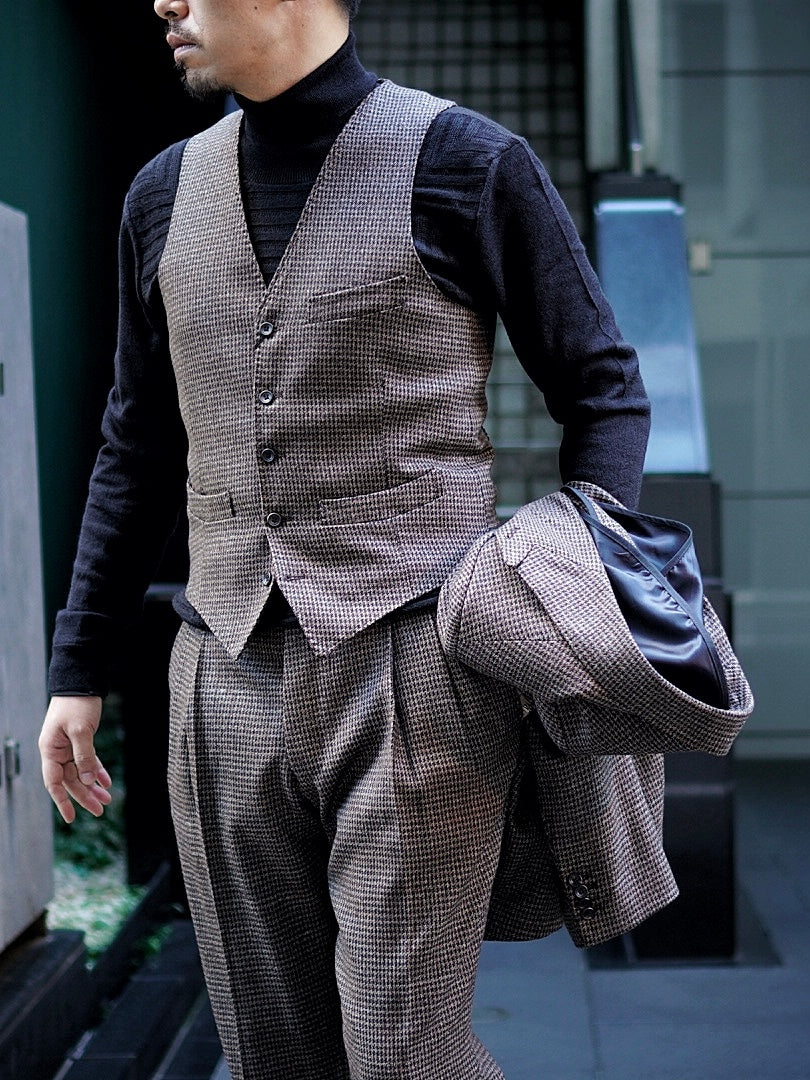 構築的な肩の作り、細目にシェイプされたウエストと、立体的なボディラインは、サヴィルロウで培ったメンズテーラーの真骨頂とも呼べるモデルです。