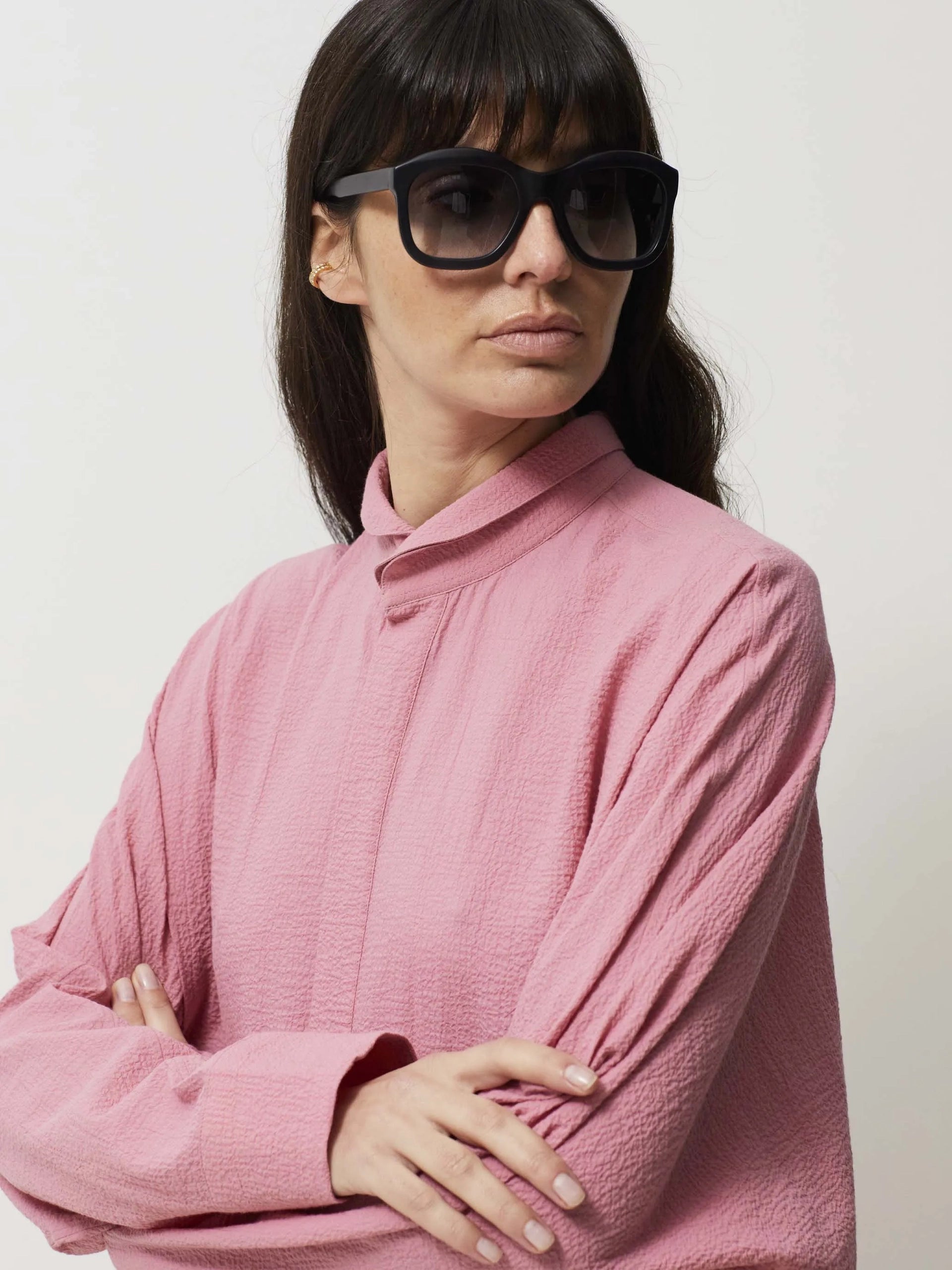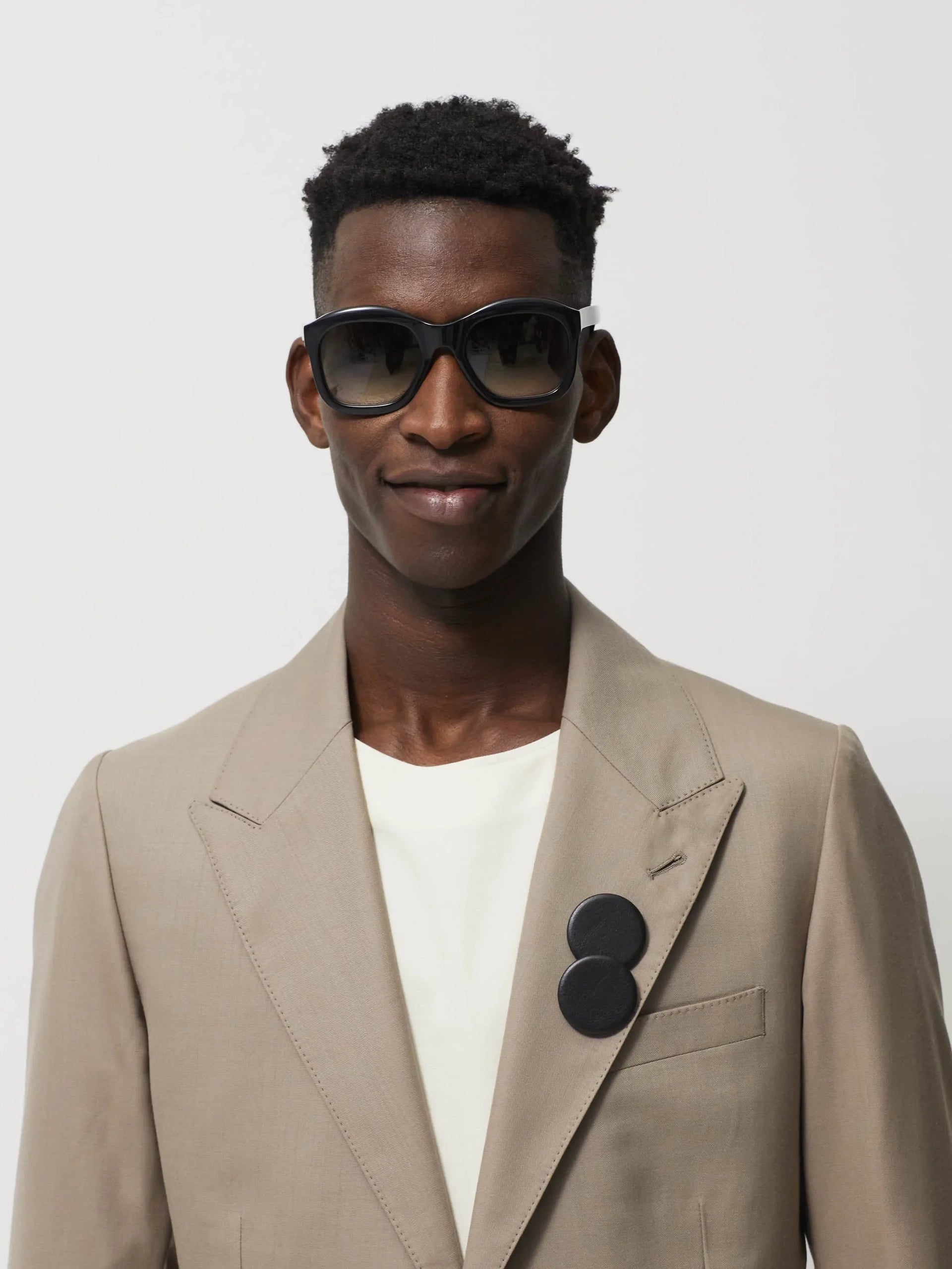 フロント上部のカーブは、1枚のアセテートから職人による手作業で削り出された立体的な造形。